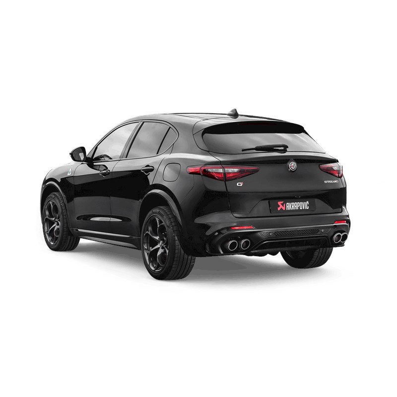 Das sportliche Auspuffsystem der Firma Akrapovič in der Slip-On Line-Version ist speziell für die Alfa Romeo Stelvio Quadrifoglio konzipiert.
