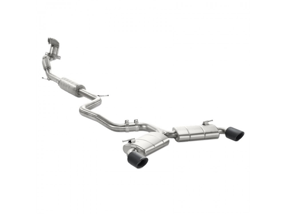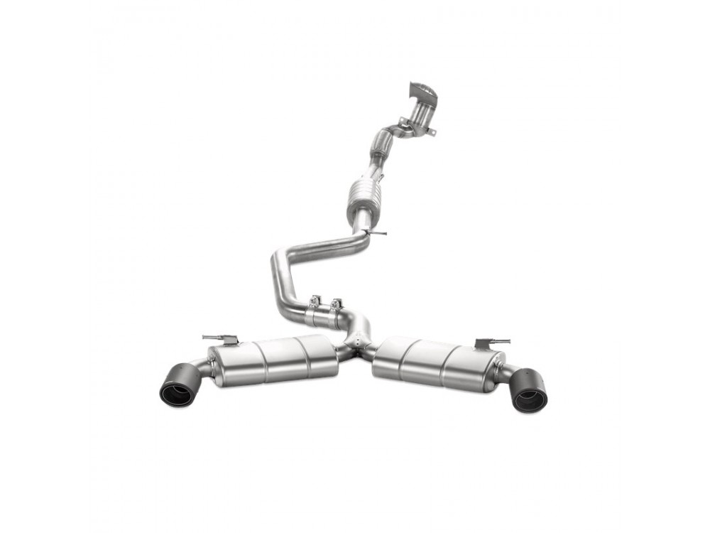 Das gesamte System besteht aus einer von Akrapovič patentierten Titanlegierung, die eine erhebliche Gewichtsreduzierung ermöglicht. Das System endet mit karbonfaserverstärkten Endrohren. Für die Montage dieses Auspuffs sind keine Modifikationen erforderlich, er passt perfekt zum Fahrzeug. Es stehen zwei Varianten des Endschalldämpfers zur Auswahl: Standard und Race. Das Produkt verfügt über ein EC-Zertifikat (in der Standardversion). Als Ergänzung zur Modifikation ist auch ein Diffusor erhältlich, der aus demselben Kohlefaser-Material wie die Endrohre gefertigt ist.