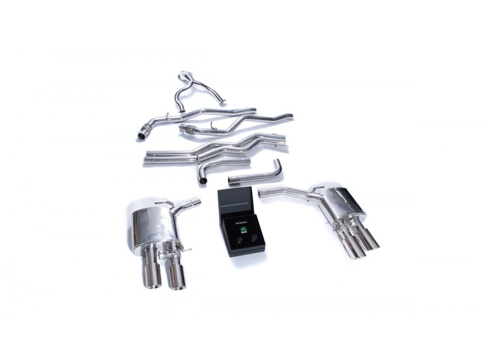 Sportauspuffanlage vom Typ Cat-back von Armytrix, die für den Audi A7 C8 55 TFSI entwickelt wurde.Die gesamte Anlage besteht aus Edelstahl der Legierung T304. Die Anlage endet mit wahlweise: poliertem Silber, mattemschwarz, blauen Titanium-Stil oder Carbon.