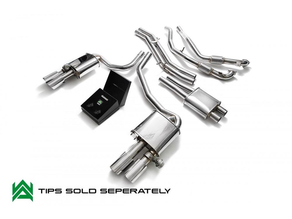 Sportauspuffanlage vom Typ Cat-back von Armytrix, die für Audi S4 B9 3.0 TFSI Limousine entwickelt wurde.Die gesamte Anlage besteht aus Edelstahl der Legierung T304. Die Anlage endet mit wählbaren Endrohren: poliertem Silber, mattem Schwarz, blauen Titanium-Stil oder Carbon.