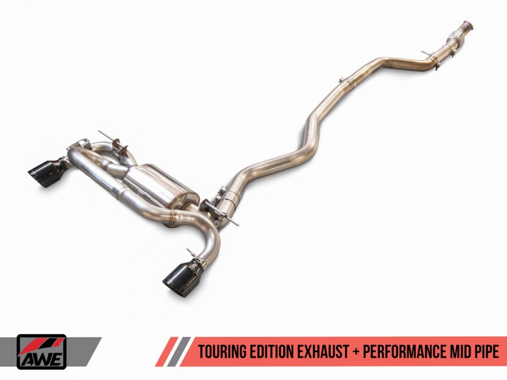 Der Auspuff in der Touring-Version ist mit der von AWE Tuning patentierten 180º-Technologie ausgestattet, die einen sportlichen Klang und hohen Fahrkomfort gewährleistet (kein "Drone"-Effekt).