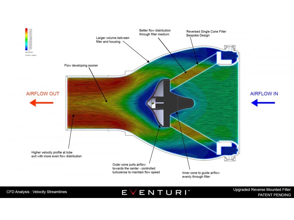 Im Gegensatz zu vielen Herstellern von Ansaugsystemen, die Standardfilter verwenden, haben wir dank umfangreicher Forschungs- und Entwicklungsarbeiten sowie Investitionen eine außergewöhnliche Filterkonstruktion entwickelt, die optimale Leistungsparameter durch eine patentierte umgekehrte Konfiguration gewährleistet. Das Filtermaterial besteht aus einem Vliesnetz, das gemäß ISO 5011 getestet wurde und die Anforderungen an serienmäßig montierte Filter erfüllt. Das Netz besteht aus zwei Schichten und ist vollständig trocken, was bedeutet, dass kein Risiko einer Beschädigung des Luftmassenmessers durch Ölverunreinigung besteht. Die Filter umfassen zwei Kegel, die den Luftstrom gemäß der folgenden Beschreibung leiten:
