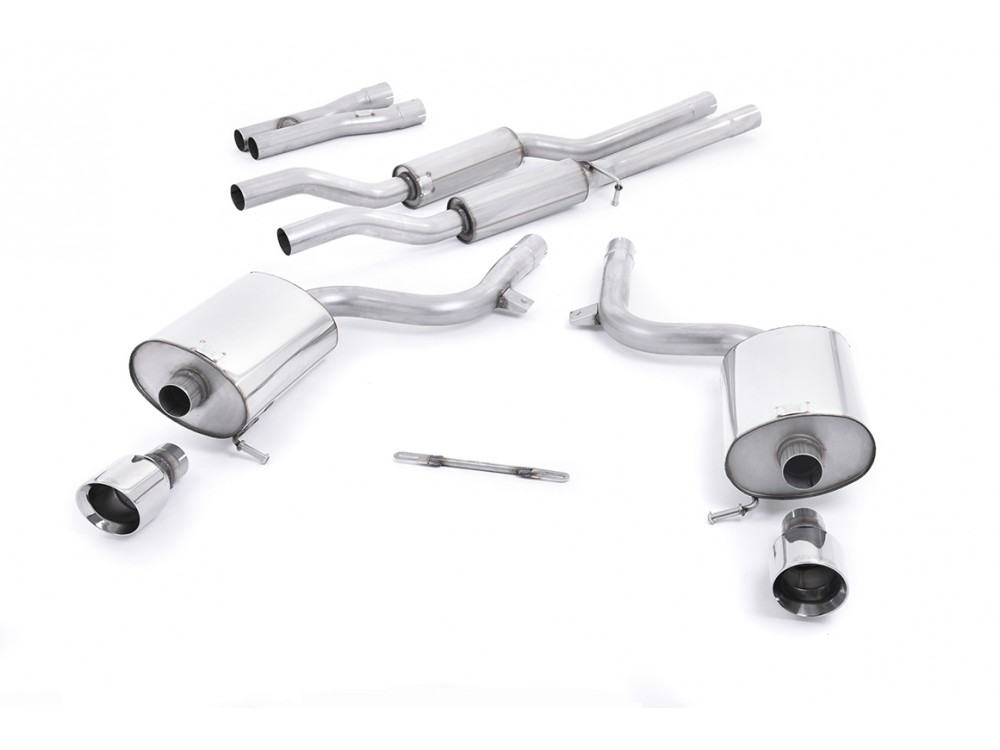 Sportauspuffanlage vom Typ Cat-back der Firma Milltek Sport, die für Audi A4 3.0 V6 B6 quattro Limousine Avant & Cabriolet (2001-2005) bestimmt ist.