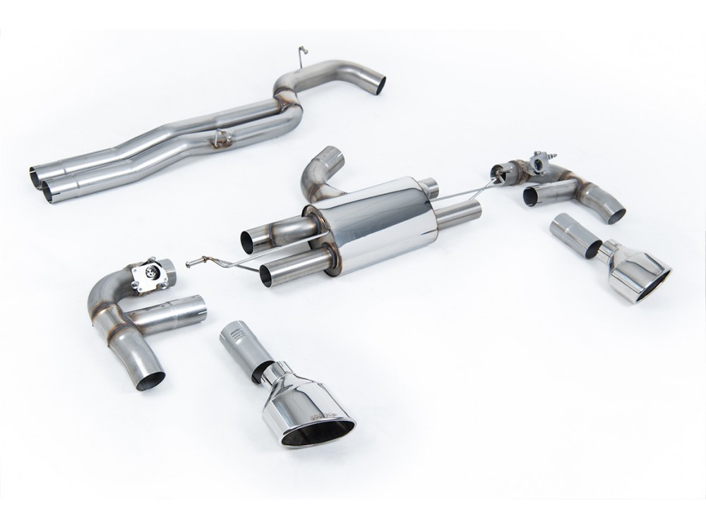 Sportauspuffanlage vom Typ Cat-back der Firma Milltek Sport, die für den Audi RS3 Sedan 8V 2.5 TFSI (auch für Fahrzeuge mit GPF-Filter) entwickelt wurde.
