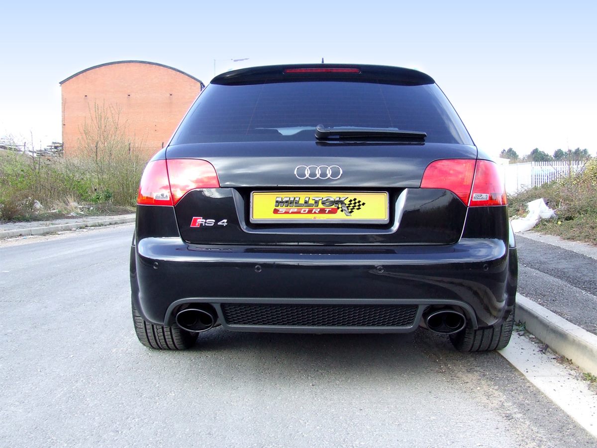 Sportauspuffanlage vom Typ Cat-back der Firma Milltek Sport, die für Audi RS4 B7 4.2 V8 Limousine Avant und Cabriolet (2006-2008) bestimmt ist.