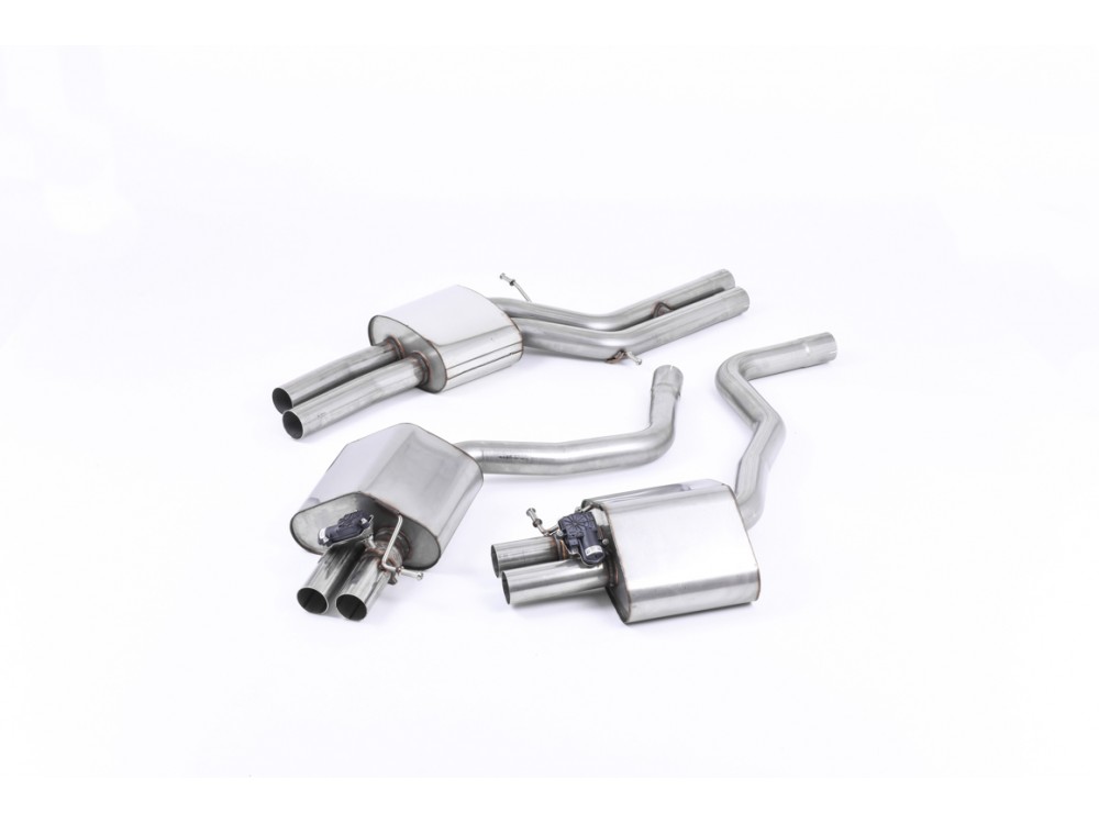 Der sportliche Cat-back-Auspuff von Milltek Sport ist speziell für den Audi RS6/RS7 C7 4.0 TFSI entwickelt. Er besteht vollständig aus Edelstahl und ist mit den Endrohren im hinteren Stoßfänger verbunden. Der Auspuff ist in der lauteren Non-resonated-Version sowie in der leiseren Resonated-Version erhältlich. Das System ist mit dem serienmäßigen Downpipe kompatibel. Alle Versionen verfügen über Endschalldämpfer, die mit Klappen ausgestattet sind, die über das Bordcomputer-System gesteuert werden.