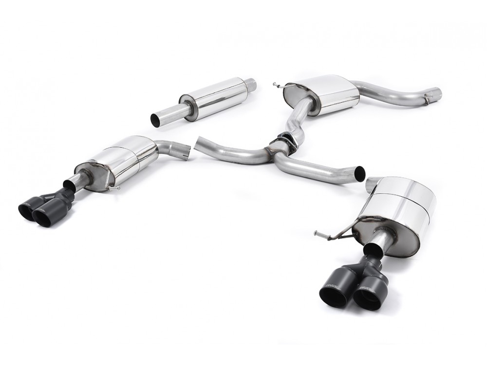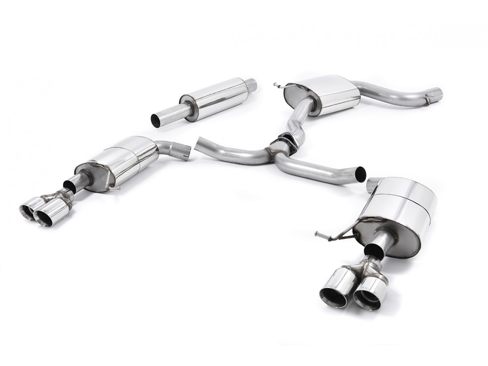 Die gesamte Anlage ist aus Edelstahl gefertigt und endet mit 2 oder 4 Endrohren. Der Auspuff ist in der lauteren Non-resonated-Version sowie in der leiseren Resonated-Version erhältlich. Das System ist mit dem serienmäßigen Downpipe kompatibel. Version mit EC-Zertifikat.